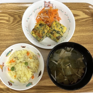 ・カレーピラフ・小松菜キッシュ・キャロットサラダ・青梗菜のスープ