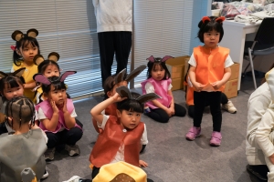 子ども達が大好きな絵本『ぽん ちん ぱん』の劇遊びでは、ぽんちんぱんのリズムに合わせて手拍子をしたり、