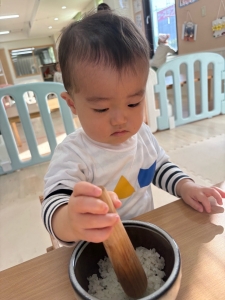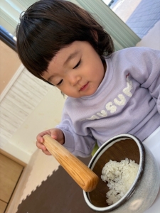 ゆき組(0歳児)は室内ですり鉢を使ったお餅つき体験を行い